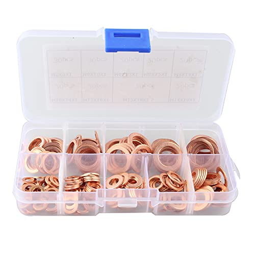 HALJIA 200 st koppar platta brickor kit kopparbricka sortiment kit M5 M6 M8 M10 M12 M14 metallbrickor tätningar tätningsring bricka för mekanisk 9 storlekar med plastlåda