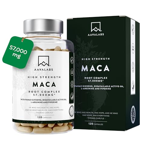 Maca-rot kapslar – 57.000 mg – 120 kapslar med svart och gul maca-rot för män och kvinnor – med panax ginseng, L-arginin, B6-vitamin och svartpepparextrakt – Veganskt
