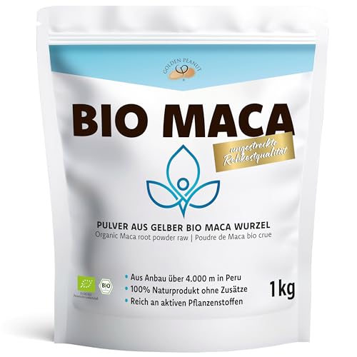 GOLDEN PEANUT Maca pulver 1 kg, ekologisk maca från Peru, fylld i Tyskland, rå mat utan tillsatser, lepidium meyenii, gul macarot