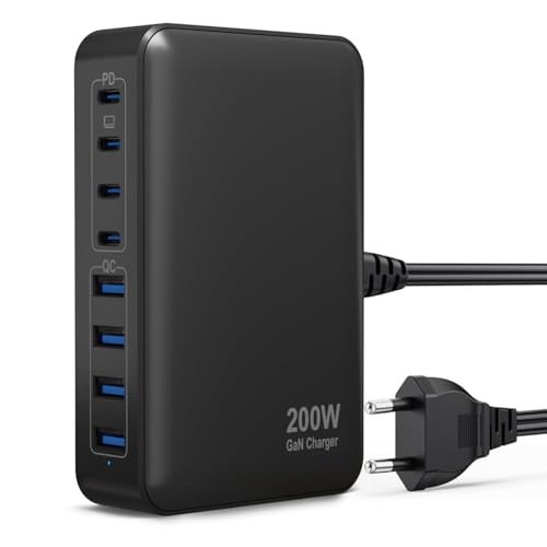 Multi-Port USB C Charger, 200 W laddningsstation med 8 portar【4 USB C 4 USB A】, PD+QC USB Fast GaN-laddare, kompatibel med MacBook Pro/Air, Google Pixelbook, ThinkPad, Galaxy S23/S22/S21