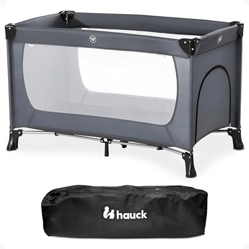 Hauck Dream N Play Plus 3-Delad Resesäng med Bärväska + Vikbar Madrass, 120 x 60 cm, från Födsel upp till 15 kg, Tippsäker - grå