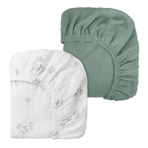 Peepeemax Musselin-bomull spännlakan för pojkar och flickor, barnvagn spännlakan stuvvagn madrasskydd för mosekorg, babysäng och sidosäng 80 x 40 cm, 2-pack (Grön)