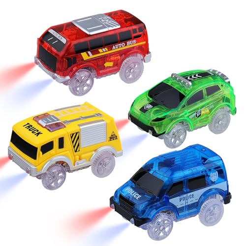 4-pack leksaksbilar tracks Cars Magic bilar lyser i mörkret för barn 3–8 år, polisbil, buss, brandbilar, lastbilar med 5 LED-lampor, billeksak, ersättning som kör på räls