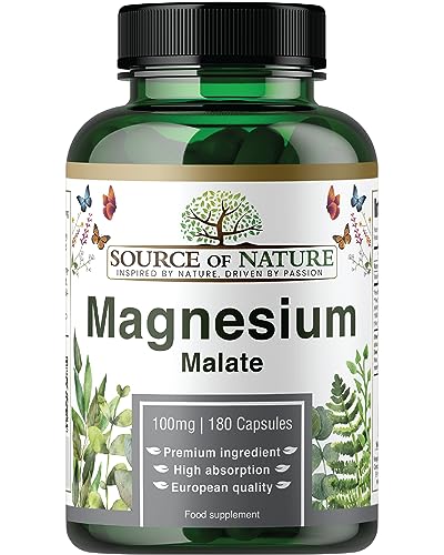 Source of Nature® | Magnesium Malat 645mg | 180 Kapslar | 2 Månaders Förbrukning | 100mg Elementärt Magnesium | Hög Biotillgänglighet | Stödjer Energi & Muskelfunktion | Skonsam för Magen | Vegansk