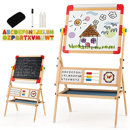 GOPLUS Barnstaffli av trä, dubbelsidig 3-i-1 målarstaffli med whiteboard, krittavla och pappersrulle, konststaffli med vridbar ritbräda, magnetbokstäver, abakus och bordstorkare