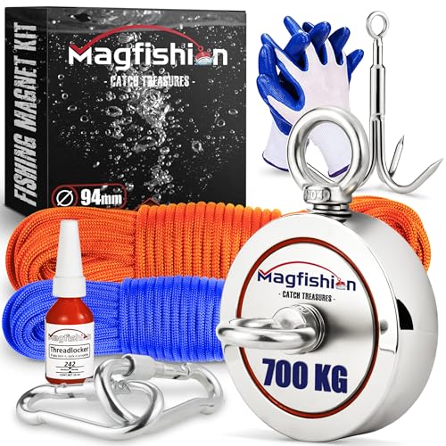 Magfishion - Magnetfiskeset – 700 KG (2 x 350 kg) – neodymmagnet – perfekt för magnetfiske – med mörkorelinje rep (20 m) och handskar – öljettmagnet – magnetfiske – Ø 94 mm
