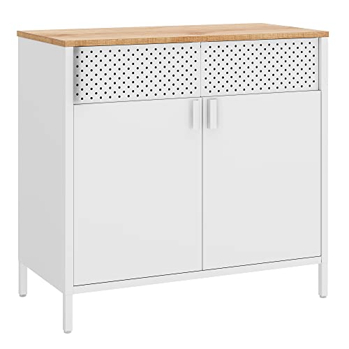 SONGMICS Förvaringsskåp, metallskänk, dubbel magnetisk dörr, justerbar hylla, stålram, trä- och vit färg LSC102W57