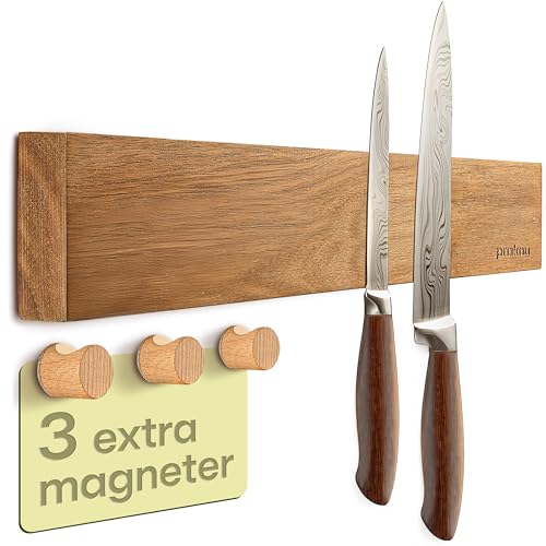Knivhållare Magnetisk 40cm av FSC® Acacia-trä med Extra Stark Magnet - 3 Krokar för Handdukar - Enkel Montering