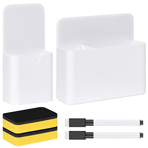 OFFCUP Magnetisk markörhållare, 2 st magnetisk pennhållare, magnetisk kopphållare whiteboard pennhållare med 2 markörer för torr radering och 2 svarta tavelsuddgummi för whiteboard, kontor, hem, skola