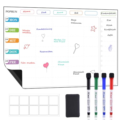POPRUN Magnetisk veckoplanerare för familjen, kylskåp whiteboard-meny, planeringstavla, torkningskalender inköpslista 43 x 28 cm på tyska