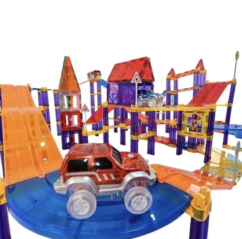 WonderToys 122 stycken racerbilsbanor, byggklossar, pedagogisk leksak, magnetiska plattor, leksats, 2 lastbilar, STEM-lärande byggsats, koordination