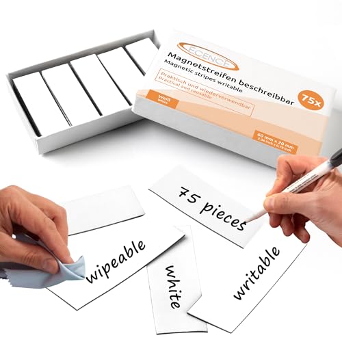 ECENCE 75 Skrivbar magnetremsa - 60x20mm Vit - Klisterremsor som kan anpassas i storlek - magnetiska skyltar som går att torka av - magnetiska etiketter för tavlor, kylskåp,