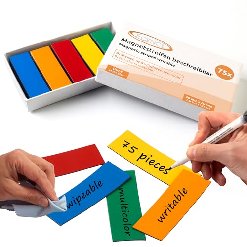 ECENCE 75 Skrivbar magnetremsa - 75x25mm Färgrik - Klisterremsor som kan anpassas i storlek - magnetiska skyltar som går att torka av - magnetiska etiketter för tavlor, kylskåp,