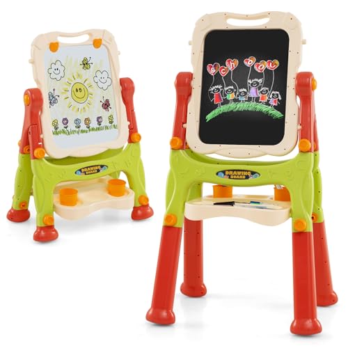 COSTWAY tavla för barn, dubbelsidig barntavla justerbar höjd med whiteboard och krittavla, stående tavla barn, magnettavla från 2 år (grön + orange)