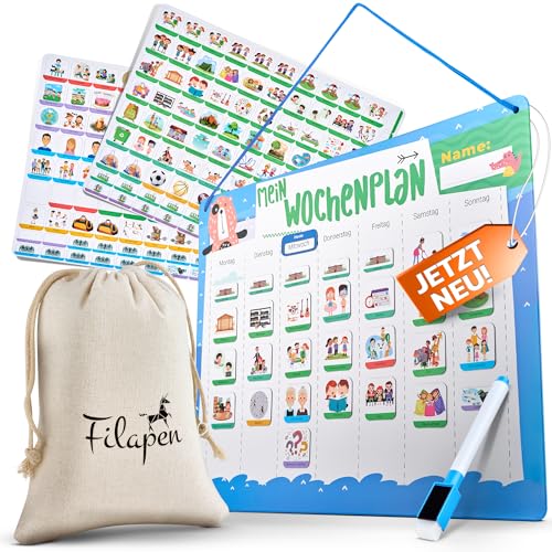 Filapen® veckoplanerare för barn – Montessori magnettavla inkl. 209 magneter, tygpåsar, penna och snöre – uppgiftsplanerare komplett beskriv- och avtorkbar – främjar självständighet