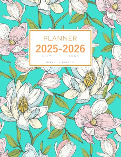 Planner July 2025-2026 June: 8.5 x 11 Weekly and Monthly Organizer | Magnolia Flower Garden Design Turquoise
