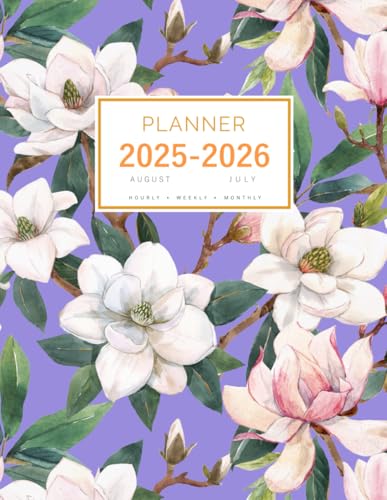 Planner August 2025-2026 July: 8.5 x 11 Large Notebook Organizer with Hourly Time Slots | Watercolor Gentle Magnolia Flower Design Blue-Violet