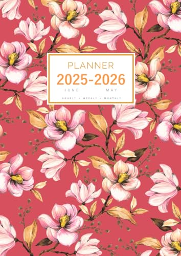 Planner June 2025-2026 May: A4 Large Notebook Organizer with Hourly Time Slots | Watercolor Magnolia Flower Design Red
