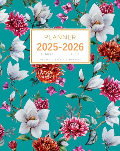 Planner August 2025-2026 July: 8x10 Large Notebook Organizer with Hourly Time Slots | Magnolia Chrysanthemum Flower Design Teal