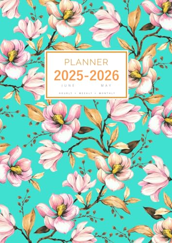 Planner June 2025-2026 May: A4 Large Notebook Organizer with Hourly Time Slots | Watercolor Magnolia Flower Design Turquoise