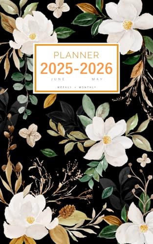 Planner June 2025-2026 May: 5x8 Weekly and Monthly Organizer Small | Hand-Drawn Magnolia Flower Design Black
