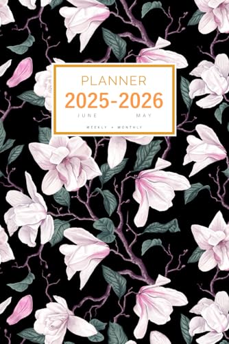 Planner June 2025-2026 May: 6x9 Weekly and Monthly Organizer | Realistic Magnolia Flower Design Black