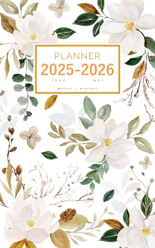 Planner June 2025-2026 May: 5x8 Weekly and Monthly Organizer Small | Hand-Drawn Magnolia Flower Design White