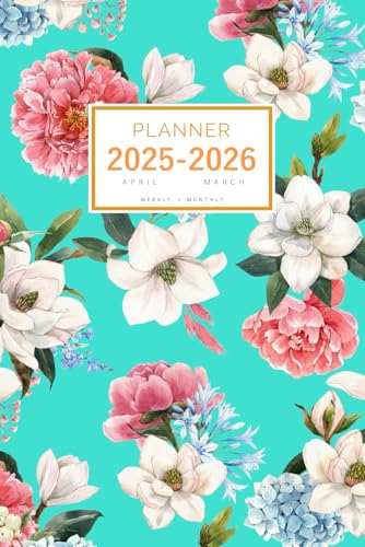 Planner April 2025-2026 March: 6x9 Weekly and Monthly Organizer | Magnolia Hydrangea Flower Design Turquoise