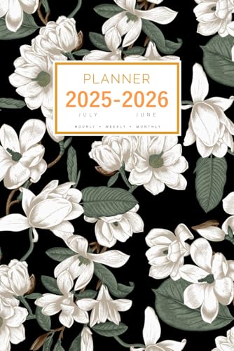 Planner July 2025-2026 June: 6x9 Medium Notebook Organizer with Hourly Time Slots | Beautiful Magnolia Flower Design Black