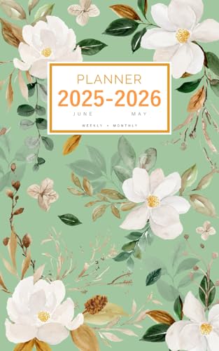 Planner June 2025-2026 May: 5x8 Weekly and Monthly Organizer Small | Hand-Drawn Magnolia Flower Design Green