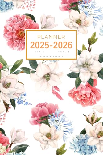 Planner April 2025-2026 March: 6x9 Weekly and Monthly Organizer | Magnolia Hydrangea Flower Design White