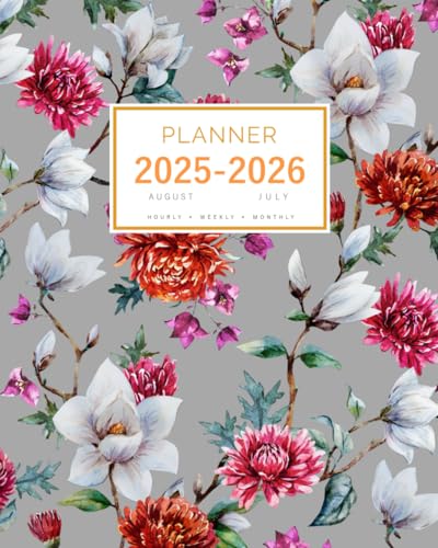 Planner August 2025-2026 July: 8x10 Large Notebook Organizer with Hourly Time Slots | Magnolia Chrysanthemum Flower Design Gray