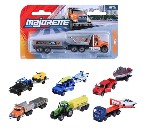 Majorette Auto City Trailer (1 modellbil) – leksaksbil av metall med släpvagn, frihjul och rörliga delar, slumpmässigt urval av 6 bilar för barn från 3 år, 7,5–13 cm vardera