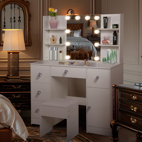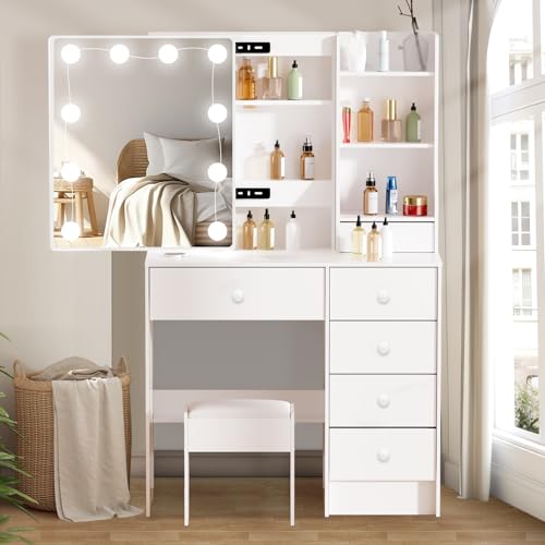 Fantaskk Sminkbord med 10 dimbara justerbara LED-lampor, vitt, 360° vridbar spegel och pall, toalettbord med 4 lådor, sminkbord med belysning, för make-up, modernt