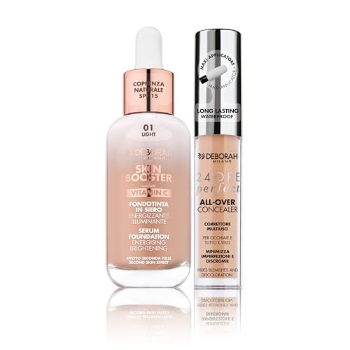 Deborah Milano-set Makeup Serum Skin Booster Foundation SPF15,01 Light, med C-vitamin, naturlig effekt, 30 ml och vätskeconcealer 24 timmar perfekt allt-over, 03 Sand, lång vattentät tätning, 5,5 g