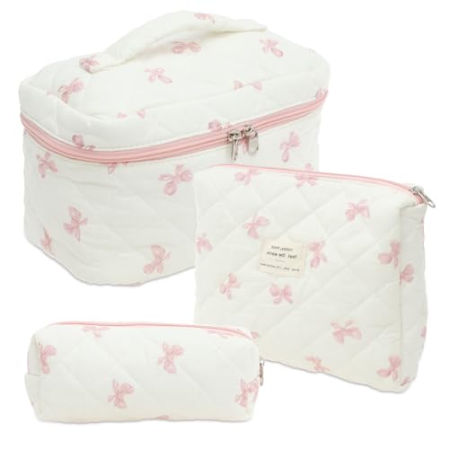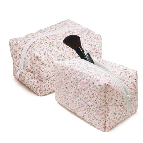 Zeyune 2 st bomull quiltad sminkväska stor resekokett makeupväska estetisk söt körsbär blommig björn sminkväska för kvinnor flickor, Som bilderna visar, Körsbärsstil