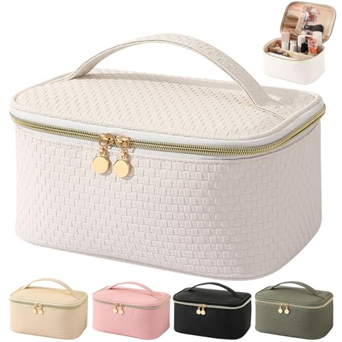 HERYEBING Makeupväska, stor kapacitet resesminkväska, PU-läder vattentät kosmetisk väska, kvinnor bärbar resesminkväska med handtag och avdelare platt lägg smink organiseringsväska, Vitt