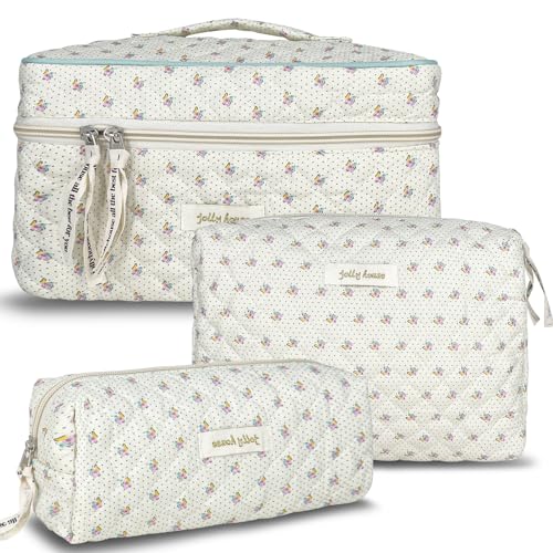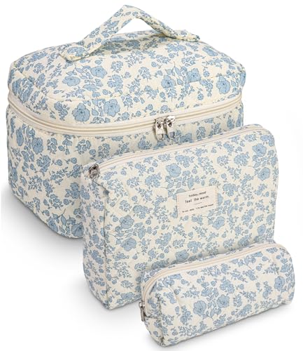 3 st bomull quiltad sminkväska, söt sminkväska för kvinnor, blommig kokett estetisk makeupväska set, resetoalettartiklar organiseringsväska., Blå vit