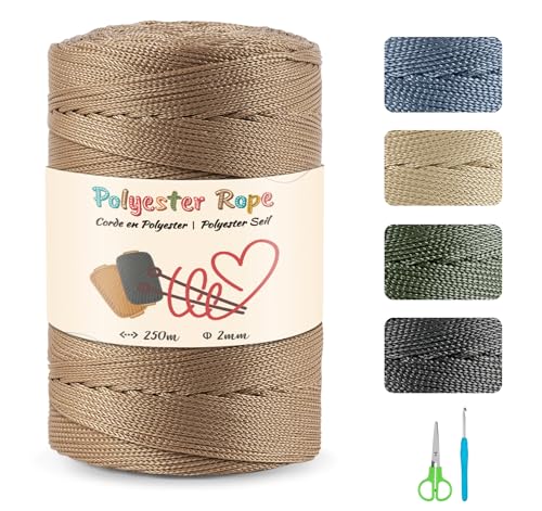 makramégarn, 2 mm x 250 m, makramé, polyestersnöre, 100 % polypropylensnöre med sax och 4 mm virkning polypropylengarn för hantverk, hemdekorationer, axelväska, handväska (latta)