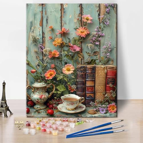 TISHIRON Måla efter siffror för vuxna – stilleben med böcker, te och blommor, 40 x 50 cm gör-det-själv oljemålning med penslar och färger, avslappnande konstprojekt för hemmet (ramlös)