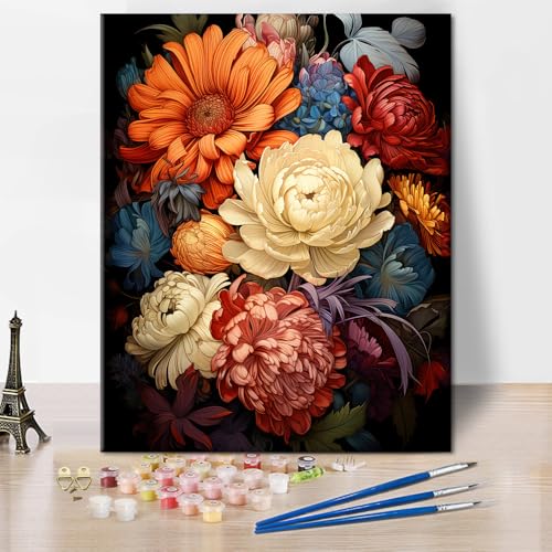 TISHIRON retro blommor målning måla efter siffror kit för vuxna och nybörjare gör-det-själv vuxen måla efter nummer kit krysantemum hortensia stil av en målning blommor oljemålning för heminredning 40
