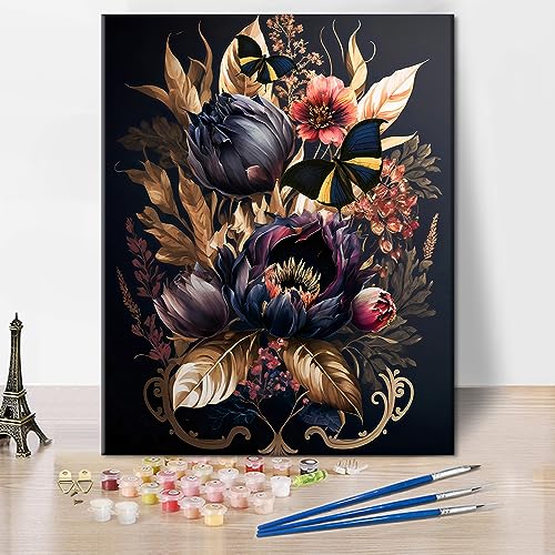 TISHIRON Blommor måla efter siffror vuxna fjäril målningsset för vuxna med penslar måla efter siffror på duk akryl pigment hantverk 40 x 50 cm (ramlös)
