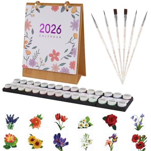 Hainue Måla efter siffror kalender 2026, gör-det-själv målning med siffror bordskalender för innehåller 12 olika blommor, med penslar akrylfärg och bas för hem, kontor, presenter och hem dekoration