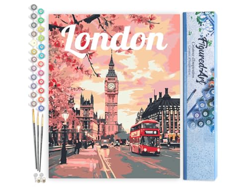 Figured'Art Måla efter nummer vuxen reseaffisch London i blommor - manuell aktivitet kreativ fritidssats DIY komplett konstnummer - 40x50 cm utan träram
