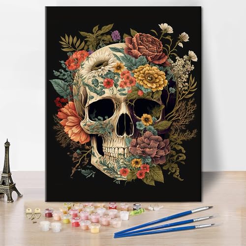 TISHIRON måla efter siffror kit vuxna skalle och blommor, måla efter siffror för vuxna barn ben blommor växt, vuxen målning med siffror kit på duk 40 x 50 cm (ramlös)