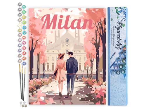 Figured'Art Måla efter nummer vuxen reseaffisch milan i blommor - manuell aktivitet kreativ fritidssats DIY komplett konstnummer - 40x50 cm utan träram