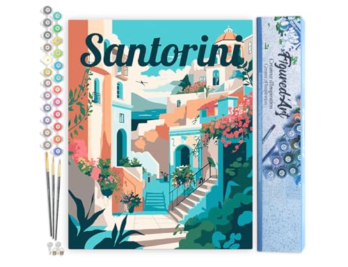Figured'Art Måla efter nummer vuxen reseaffisch Santorini i blommor - manuell aktivitet kreativ fritidssats DIY komplett konstnummer - 40x50 cm utan träram