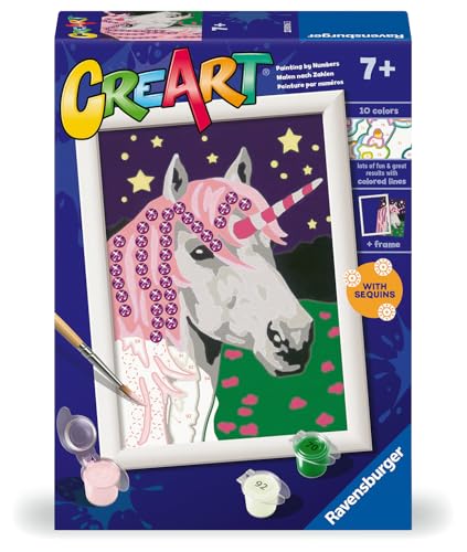 Ravensburger - CreArt E-serien: Stjärnklar enhörning, måla efter siffror, barnmålningssatser, inklusive ram, pedagogiskt och kreativt spel, presentidé för barn 7+ år, 13 x 18 cm