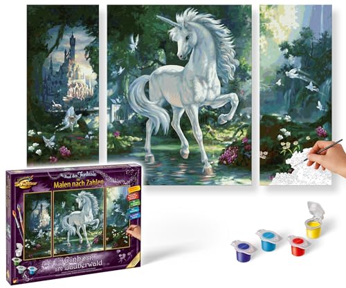 Schipper 609260866 måla efter siffror – enhörning i magisk skog – måla bilder för vuxna, inklusive pensel och akrylfärger, triptyk, 50 x 80 cm