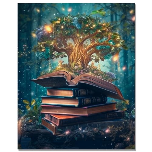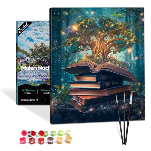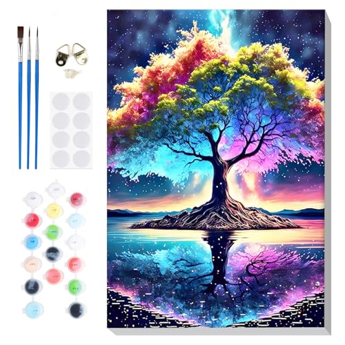 Bougimal Måla efter siffror vuxna landskap, måla efter siffror kit med penslar och pigment akryl present, magiskt träd, med ram 28 x 35 cm